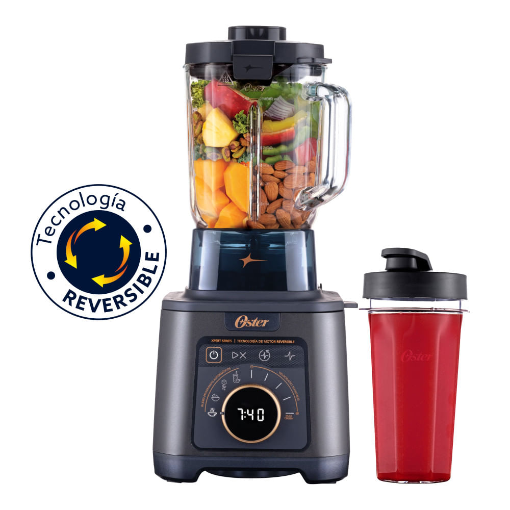 | Descripción | La licuadora profesional Oster Titan ofrece la máxima experiencia en licuado. Su motor de 2200 W hace girar la cuchilla a una velocidad de hasta 418 km/h para pulverizar ingredientes duros. Los 4 programas automáticos iBlend incluyen: Sopa que licúa y calientasopas listas para servir, Smoothie que crea mezclas cremosas, Procesar que logra salsas y aderezos homogéneos, y Triturar que convierte hielo en malteadas y granizados. También tiene 5 velocidades, incluida Max Crush para pulverizar en segundos, además Pulso y Pulso Reversible. El vaso de vidrio Boroclass de 2.5 L es resistente a ingredientes hirviendo y apto para lavavajillas. La tecnología de motor reversible mantiene la cuchilla de 6 aspas girando en ambas direcciones para evitar atascos. Para limpiarla solo hay agregar agua, jabón y licuar. Para una limpieza más profunda, se puede desarmar. Incluye un libro de recetas, apisonador, Blend-N-Go, cuchilla y llave para desarmar. Potencia pico Capacidad máxima de líquido: 2.0 L Hasta un choque térmico de 90 °C.